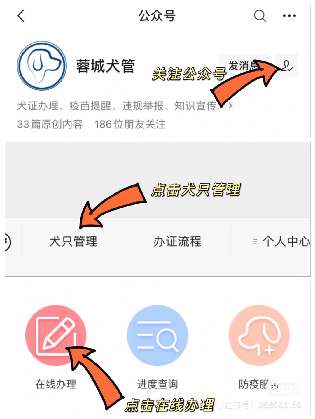 关注微信公众号“蓉城犬管”,犬只管理——在线办理——境内居民——校验身份证号——上传身份证照片、宠物照片、免疫证照片。